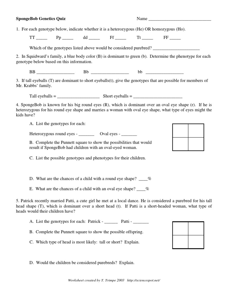 Genetics with spongebob review (pdf) use this worksheet to review punnett squares. Use the information provided and your knowledge of genetics to answer each question. Figure 4.25 (student textbook page 184): Both dominant or both recessive. One of spongebob's cousins, spongebillybob, recently met a cute squarepants gal, spongegerdy, at a local dance and fell in love. Prior to speaking about spongebob genotype worksheet answers, make sure you understand that training is our answer to a much better another day, in addition to understanding doesn't only quit once the education bell rings.that will being mentioned, many of us provide you with a variety of easy yet informative content articles and web templates designed suited to almost any academic purpose. For each genotype below, indicate whether it is a heterozygous (he) or homozygous (ho). Heterozygous round eyes, blue body _rryy_____ body color 2. Use the information provided and your knowledge of genetics to answer each question. 2 out of 4 or 50% note: Squarepants and her mother is a. Find the training resources you need for all your activities. An answer key is provided.